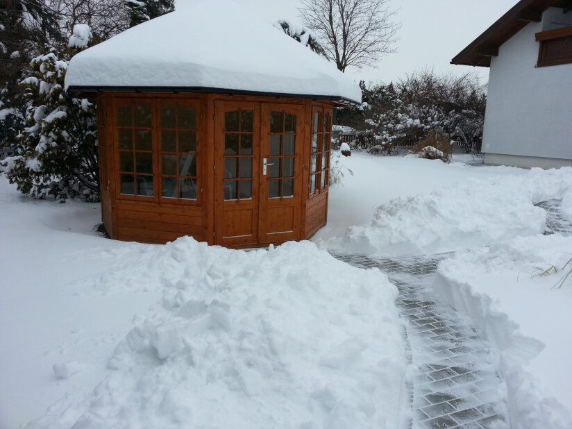 Gartenpavillon im SchneeUnser Tipp: Beraten Sie sich hierzu unbedingt mit einem Experten, der sich mit Statik auskennt. Er kann vor Ort und mit Blick auf Ihren Wunschpavillon und dessen geplanten Verwendungszweck am besten entscheiden, ob ein Fundament – und wenn ja, welcher Art – nötig ist.